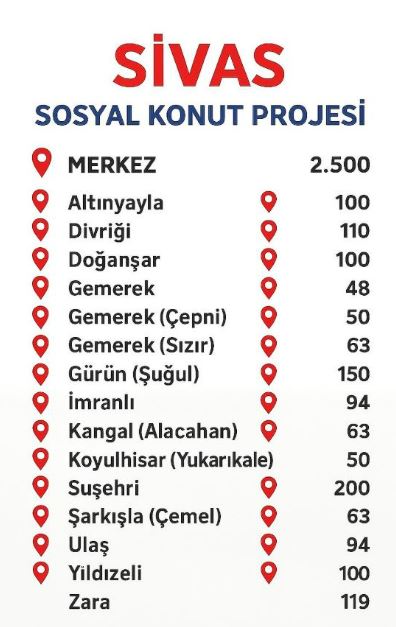 Projede en fazla konut, Sivas Merkez için planlandı. Merkezde 2 bin 500 konutun inşa edileceği proje kapsamında ilçelere ayrılan kontenjanlar ise şu şekilde açıklandı: